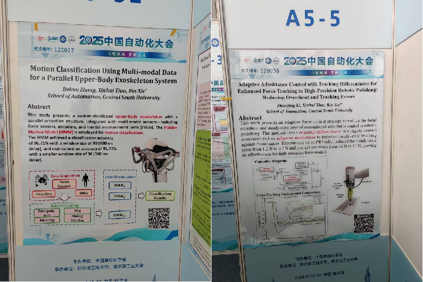 2025年10月10日-10月12日,实验室张德坤同学在黑龙江省哈尔滨市参与" 2025中国自动化大会 China Automation Congress " (CAC2025) 并进行两篇海报展示,两篇海报分别为:" Motion Classification Using Multi-modal Data for a Parallel Upper-Body Exoskeleton System ",主要介绍了一种基于多模态传感数据的外骨骼穿戴者运动模式分类方法;以及"Adaptive Admittance Control with Tracking Differentiator for Enhanced Force Tracking in High-Precision Robotic Polishing: Reducing Overshoot and Tracking Errors",主要针对打磨场景下传统导纳控制的力控性能局限性提出了改进方法,有效降低初始接触的力超调同时降低力跟踪的稳态误差。