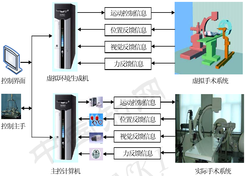 手术机器人是一种高级机器人平台,其设计的理念是通过使用微创的方法,实施复杂的外科手术。手术机器人操作采用主从控制方式,医生在双目内窥镜与三维显示系统的帮助下观察病人腹腔内的图像,在嵌入式实时控制系统的控制下,以1000Hz的控制周期实现“异构”的主操作手与从操作手之间的主从映射。